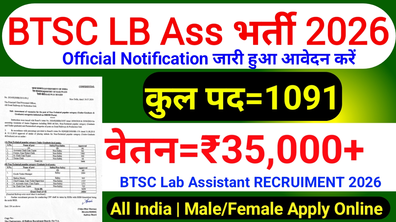 Bihar technical Service Commission btsc ki taraf se nai recruitment nikalkar a gai hai lab assistant ki jismein kul vecancy 1091 total posts ki nai Bharti hai is vacancy ko form 6 April 2026 se start ho gaya hai aur iska last date apply karne ki 6 May 2026 tak hai